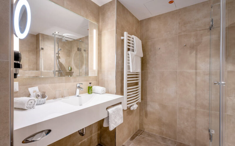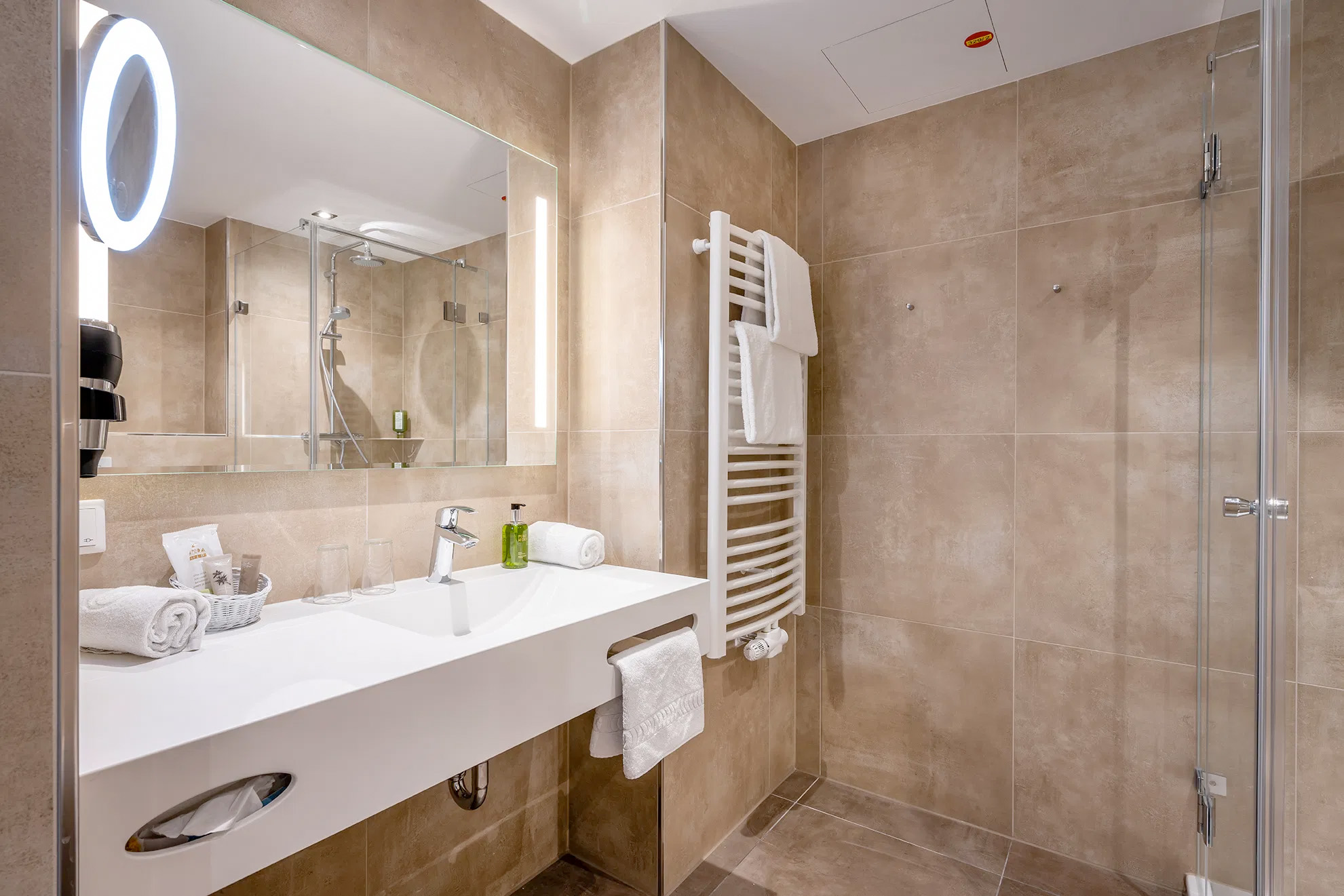 - Badezimmer mit Dusche (Rainshower), WC, beleuchteter Kosmetikspiegel und Föhn