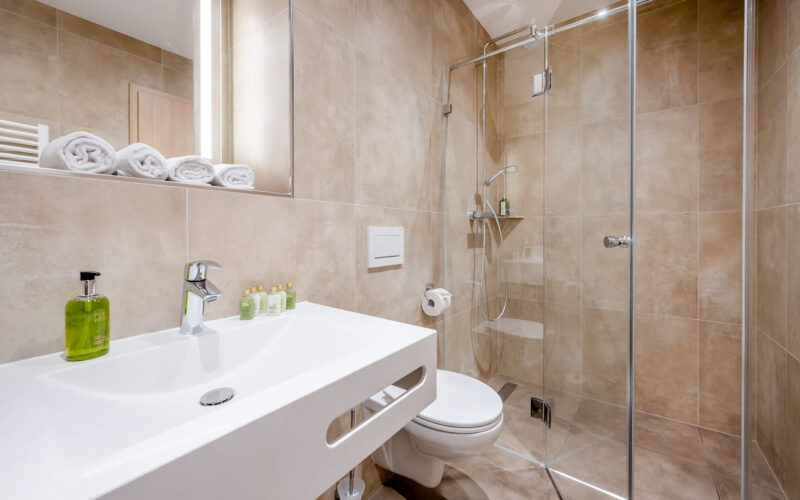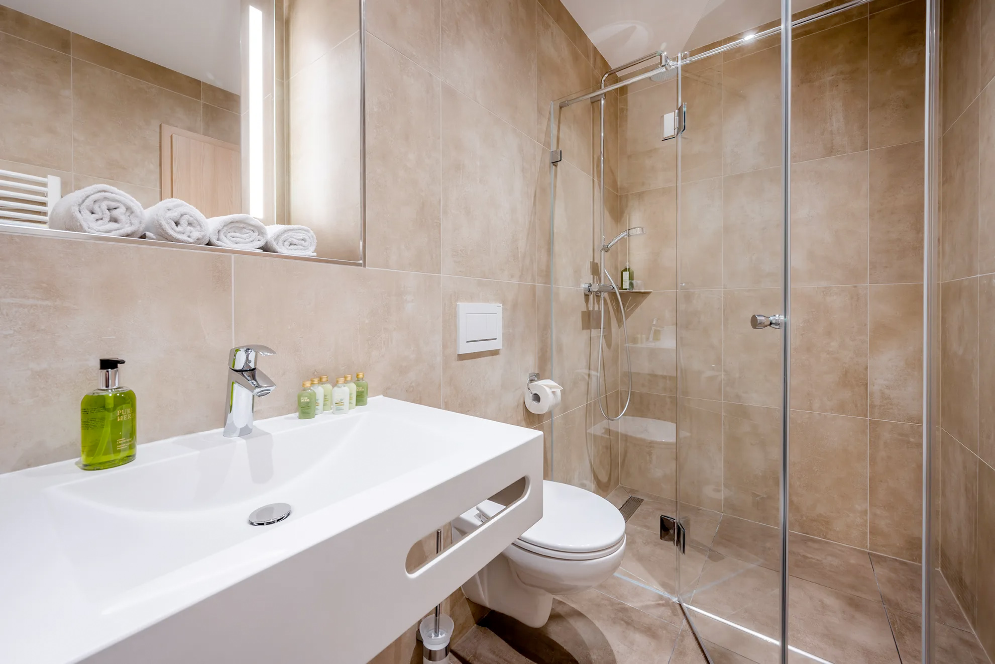 - Badezimmer mit bodengleicher Dusche, WC, beleuchteter Kosmetikspiegel und Föhn