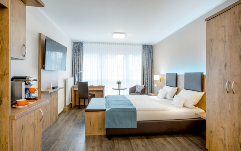Unsere Zimmer sind als Einzel- oder Doppelzimmer teils auch mit getrennten Betten buchbar. In vielen unserer Zimmer ist eine dritte Aufbettung auf einer Schlafcouch möglich. Bitte setzen Sie sich hierzu mit uns in Verbindung.