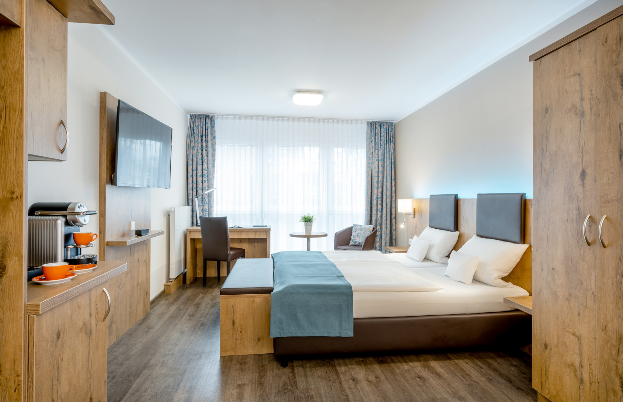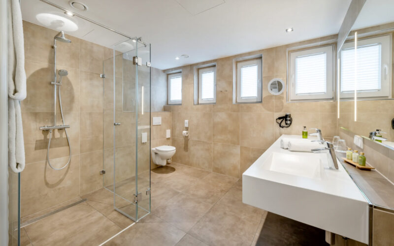 Die Junior Suite Standard ist mit einem 50'' Flat-TV, sowie Safe, Nespresso Kaffeemaschine, Bose Bluetooth Speaker, Minibar und einem Telefon ausgestattet. Das großzügige Badezimmer (rollstuhlfreundlich) verfügt über ein integriertes Radio, beleuchteten Kosmetikspiegel, Föhn sowie über eine große bodengleiche Dusche mit Rainshower und WC (Haltegriffe optional).