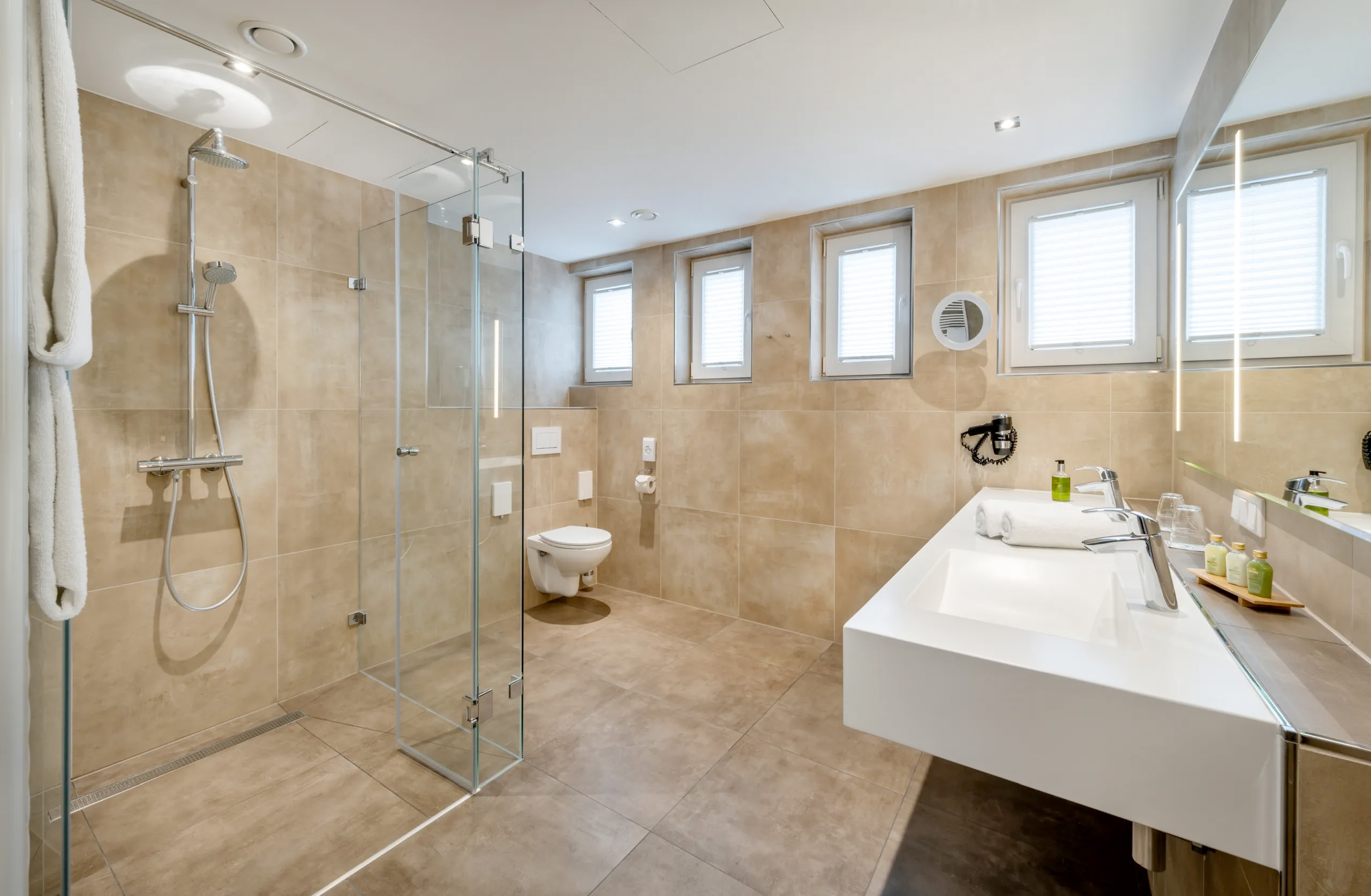 - Badezimmer (rollstuhlfreundlich) mit bodengleicher Dusche (Rainshower), WC, beleuchteter Kosmetikspiegel und Föhn