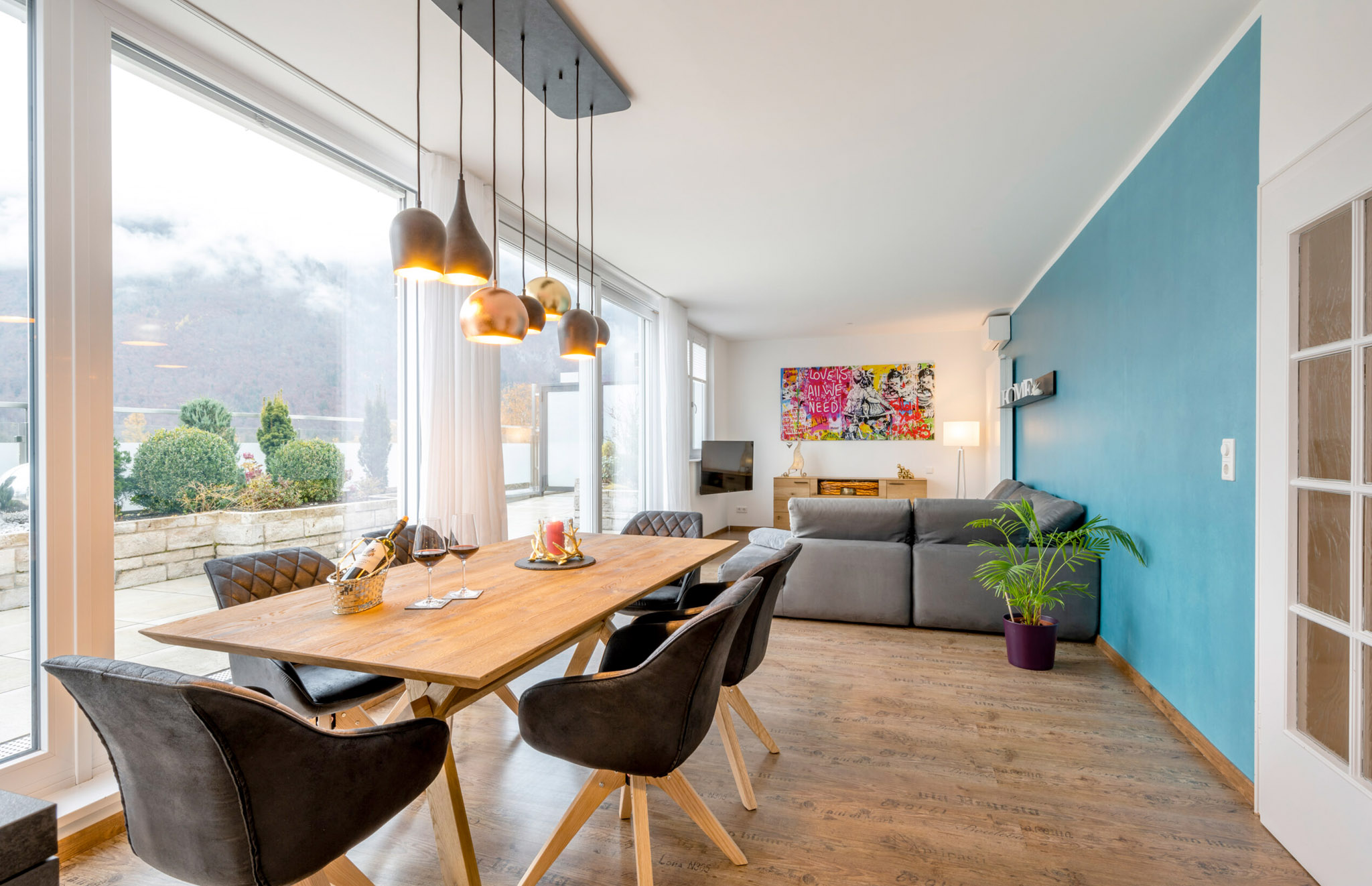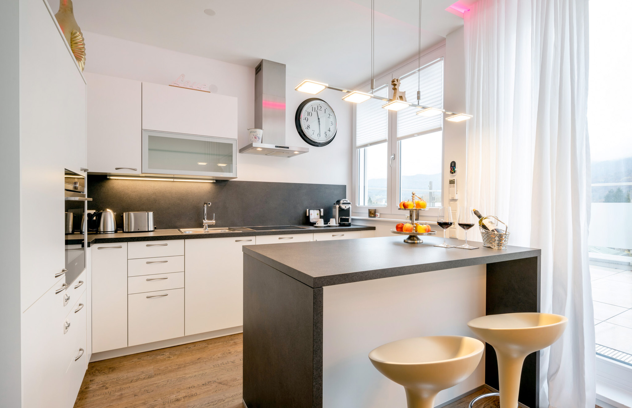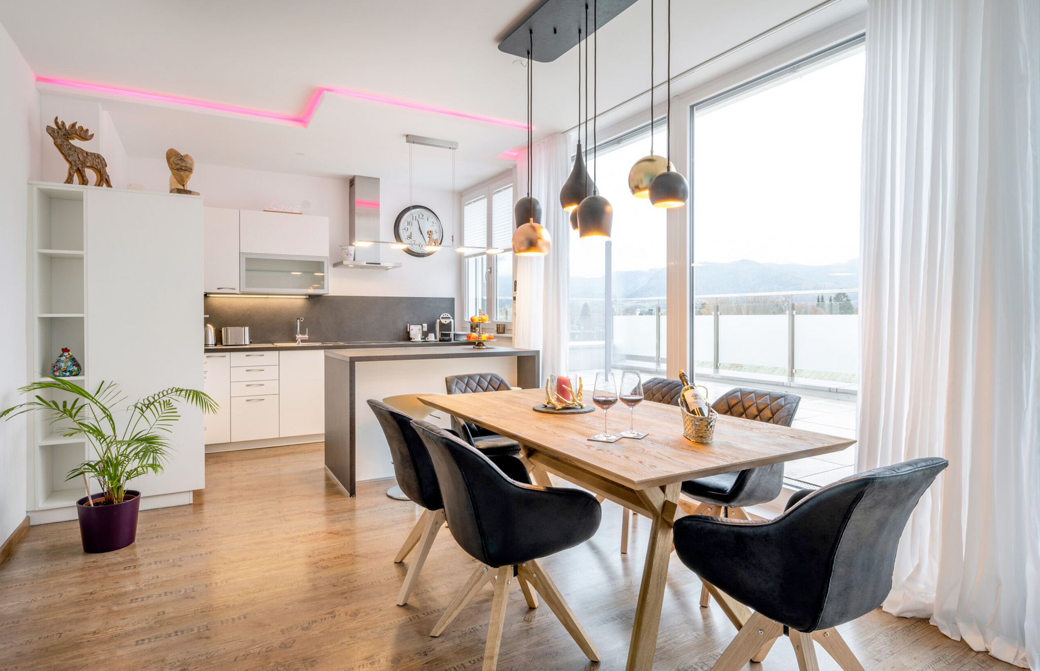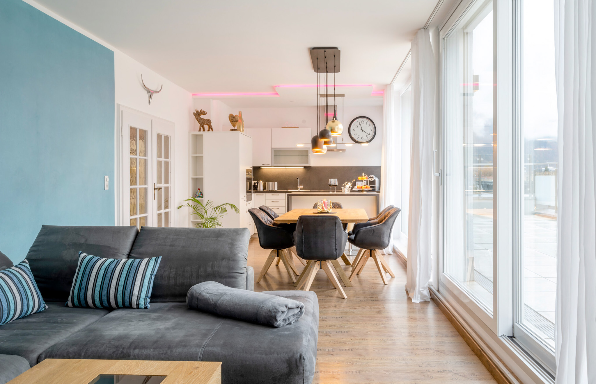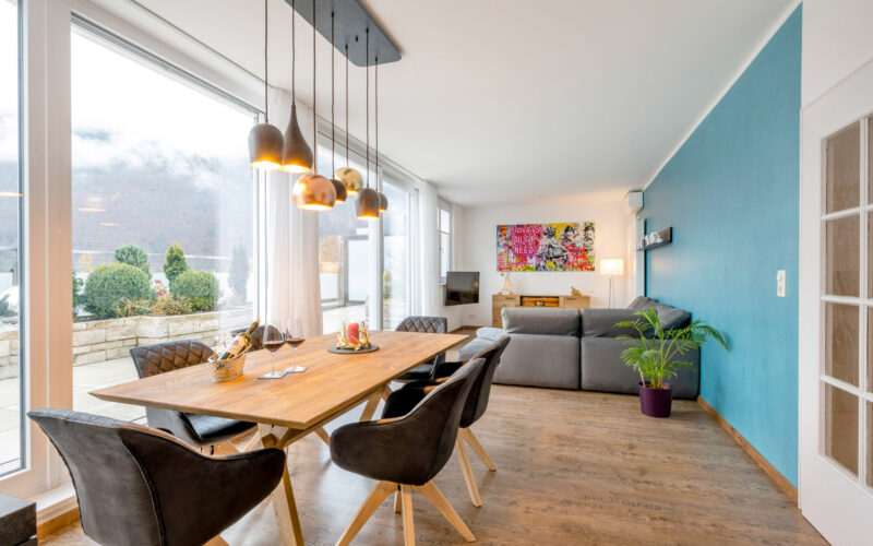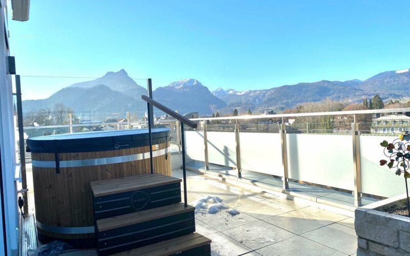 Das vollklimatisierte Penthouse Mountain View mit der besten Aussicht auf die Reichenhaller Bergwelt im 5. Stock mit herrlicher Dachterrasse (50qm) und ca. 33° Grad warmen Hotpot (Badefass) für bis zu 5 Personen (kein Pool). Großzügig, modern und mit hochwertiger Einrichtung ausgestattet. Das stylische Wohlfühlbad mit integriertem Radio, großer Dusche mit Rainshower ist ebenfalls mit einer Badewanne und einem Flat-TV versehen. Ein Traum-Penthouse zum absoluten Wohlfühlen. Der Mindestaufenthalt beträgt 3 Nächte.