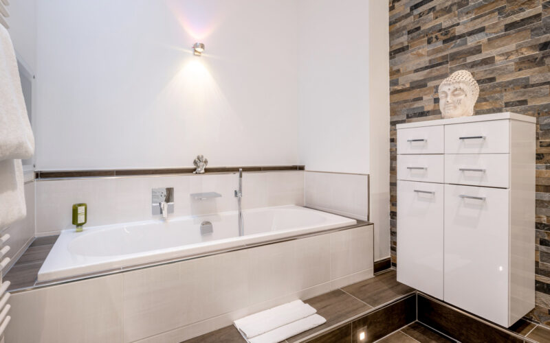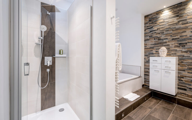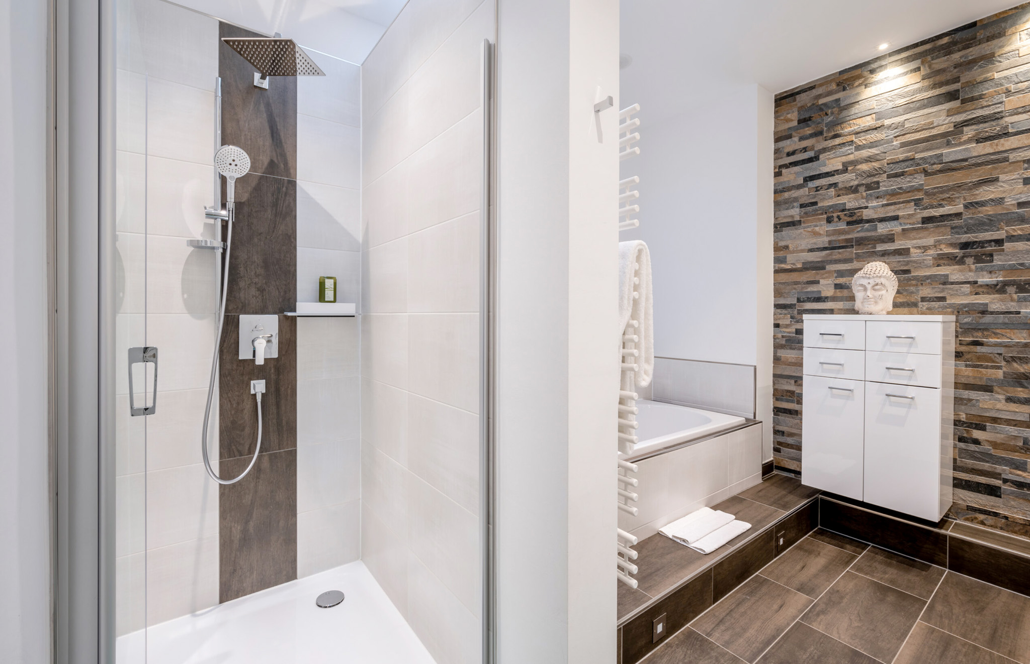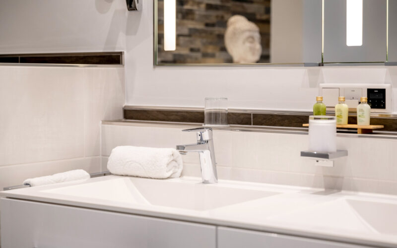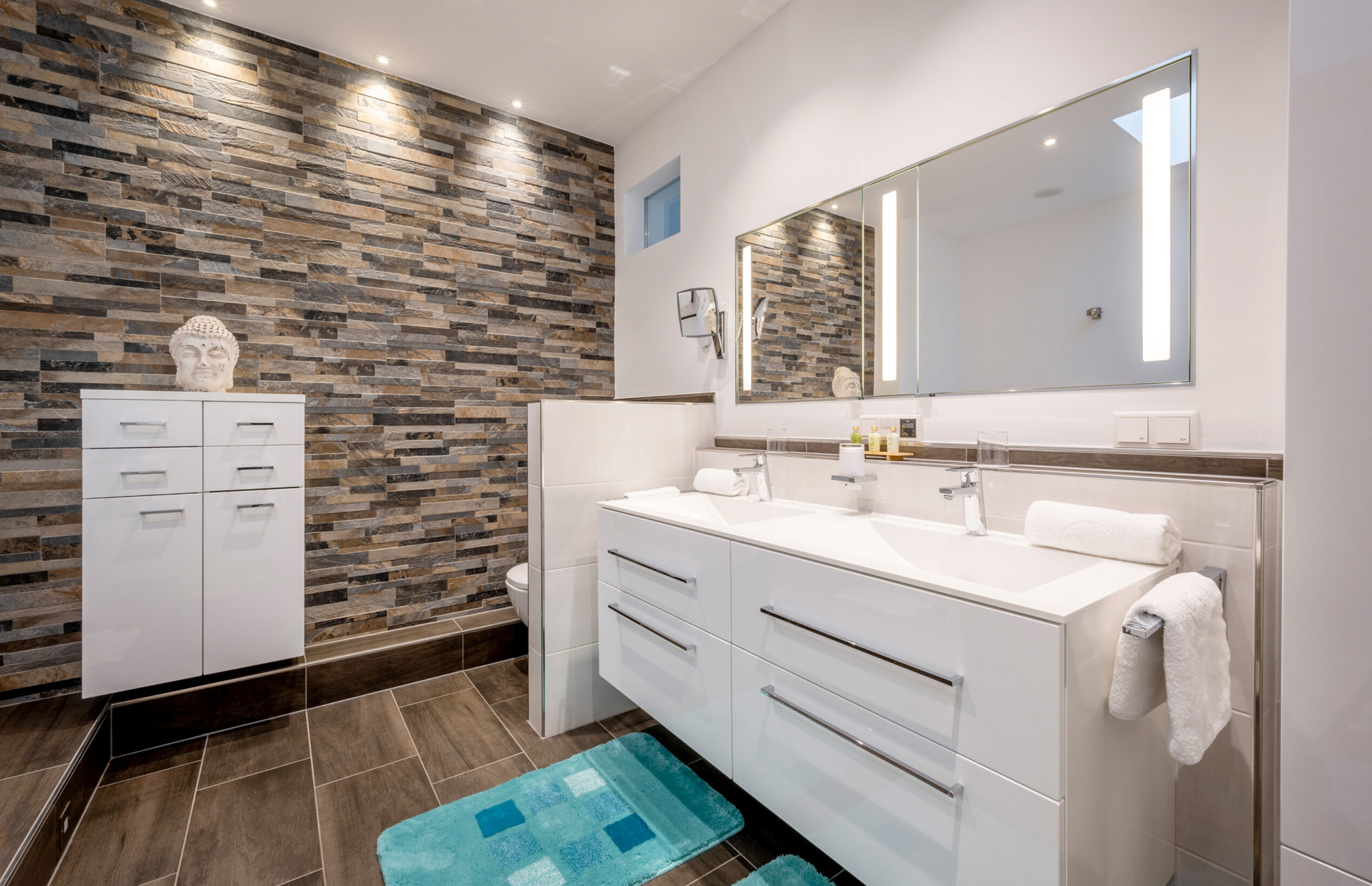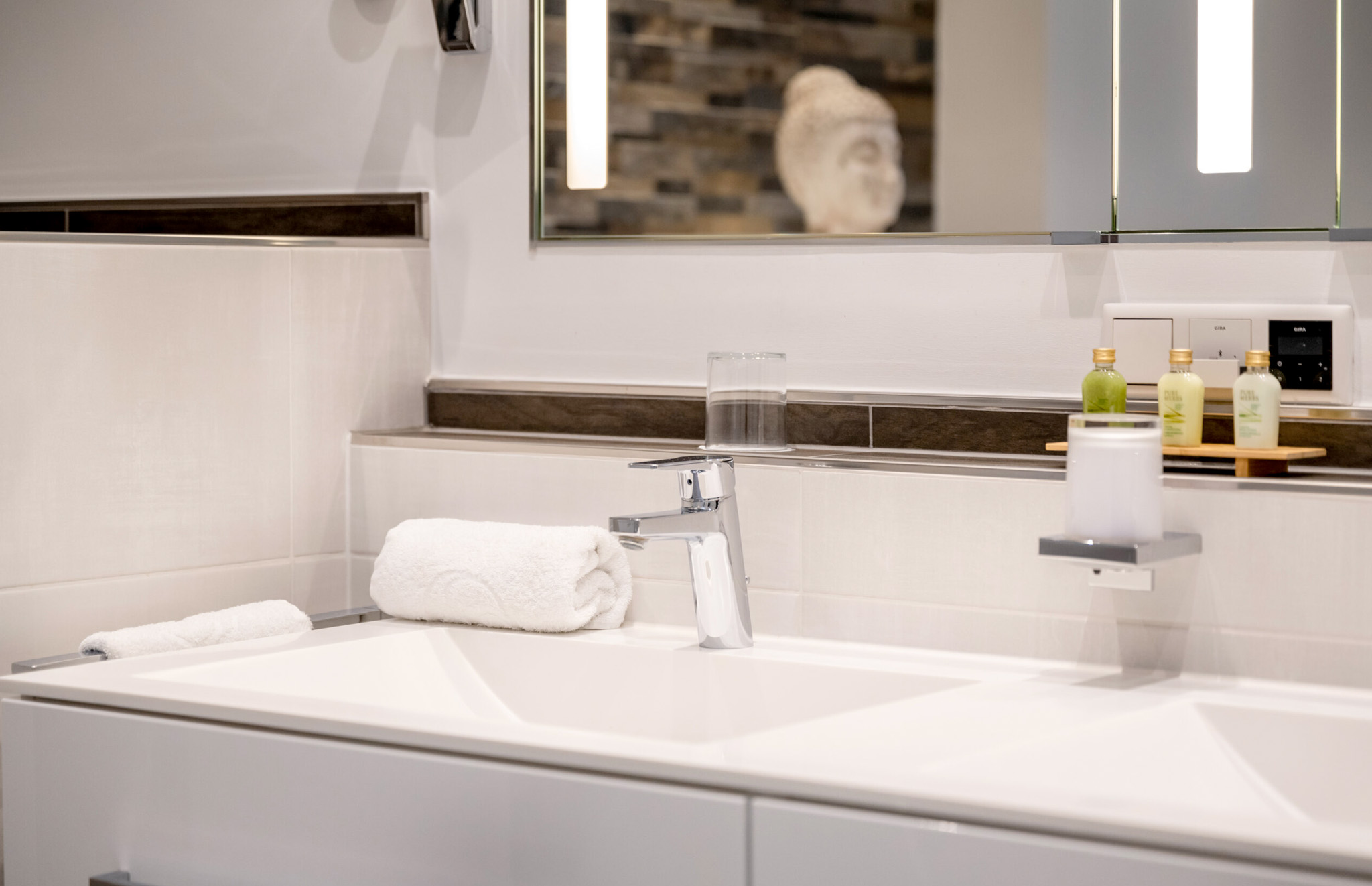 großer Rainschauer-Dusche, beleuchteten Kosmetikspiegel, Doppelwaschtisch,