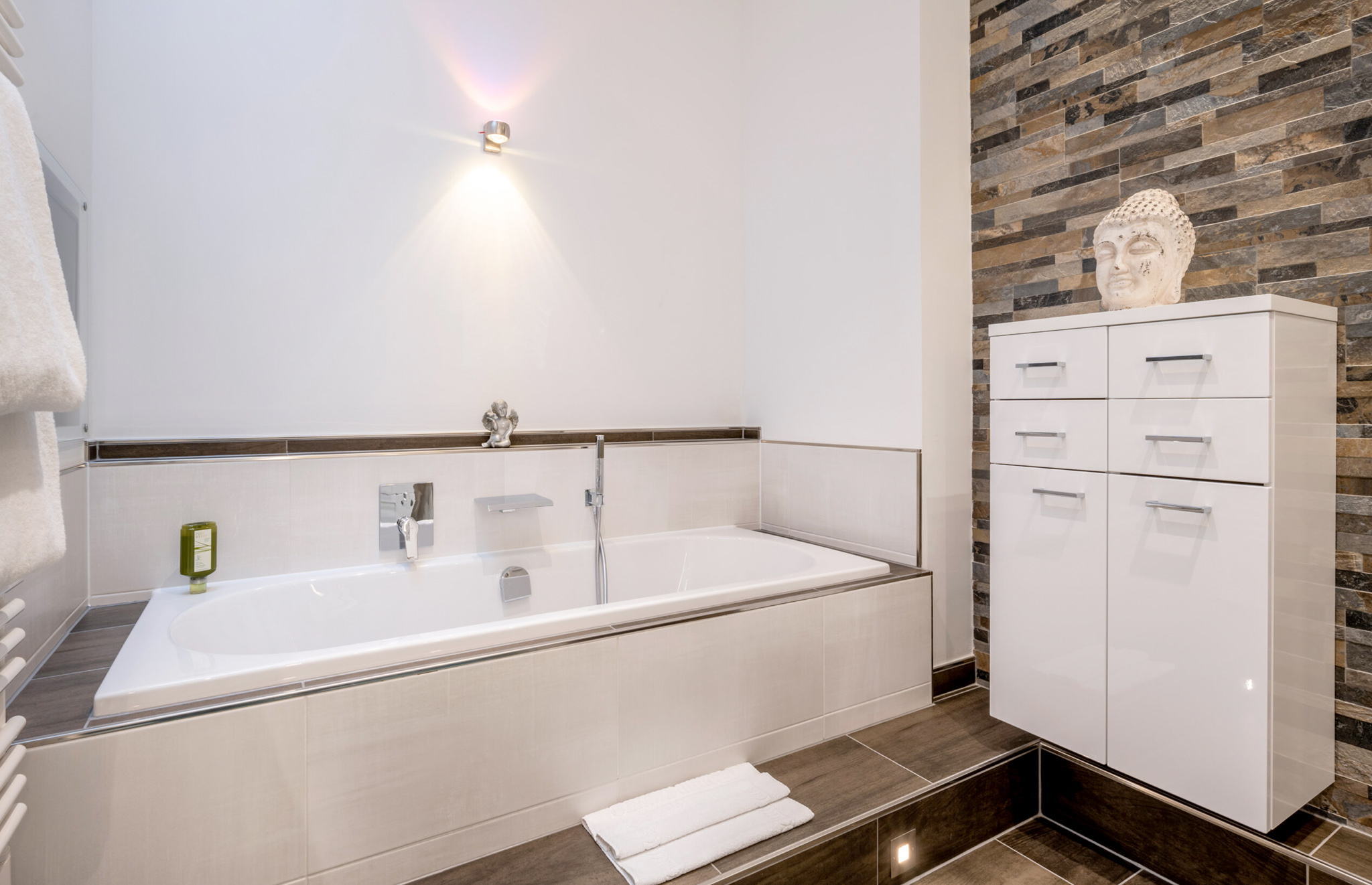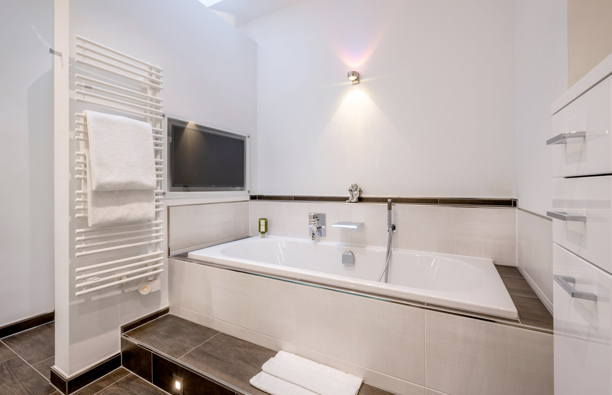 vollständig verdunkelbar durch elektrische Rollos - Luxus-Badezimmer mit großer Badewanne und integriertem Flat-TV,