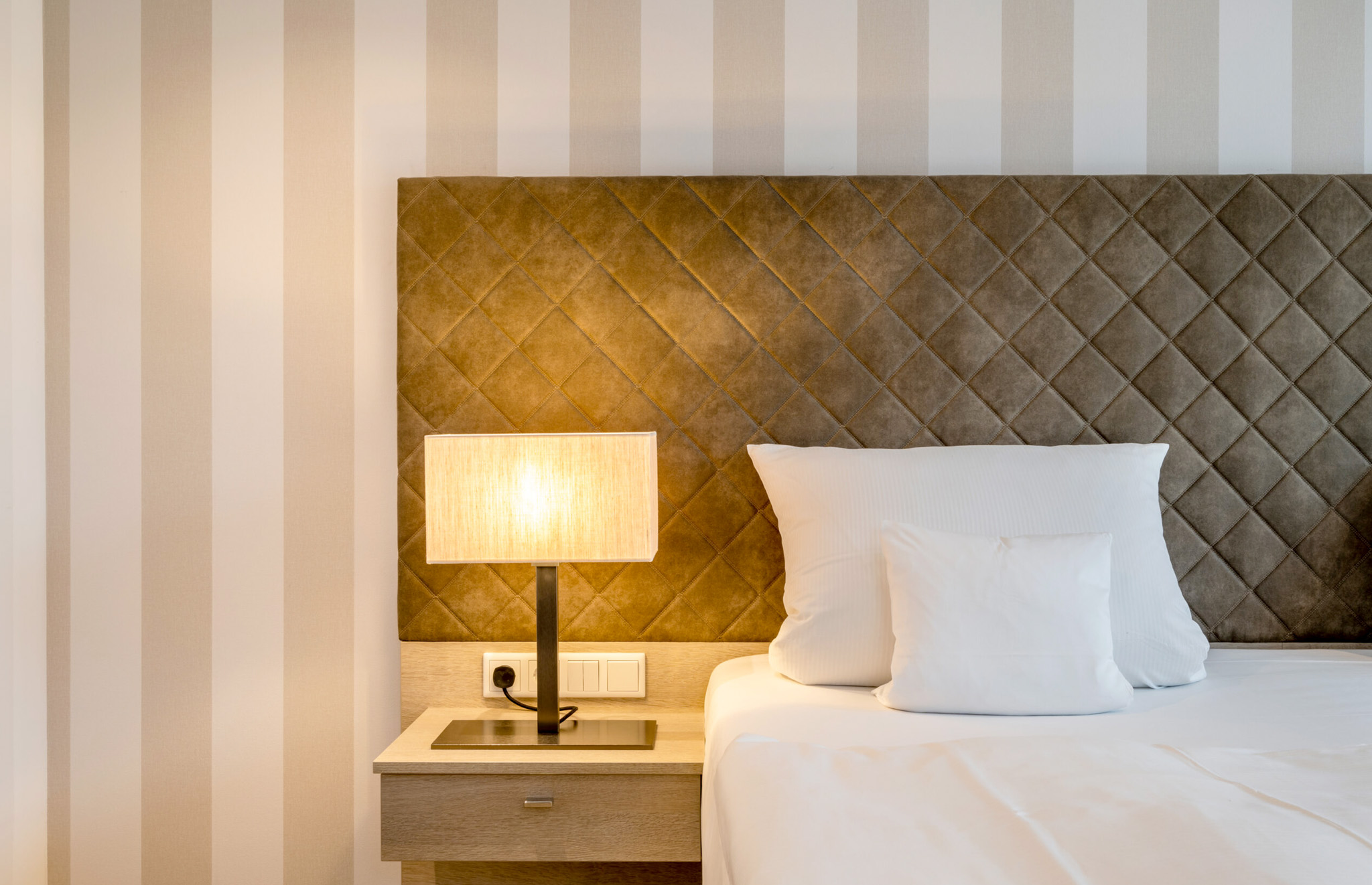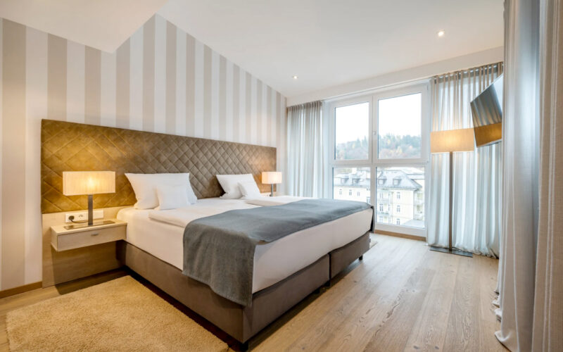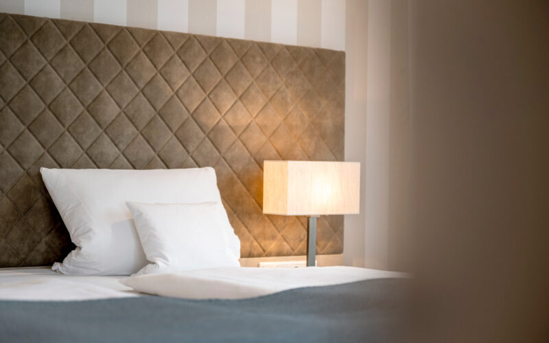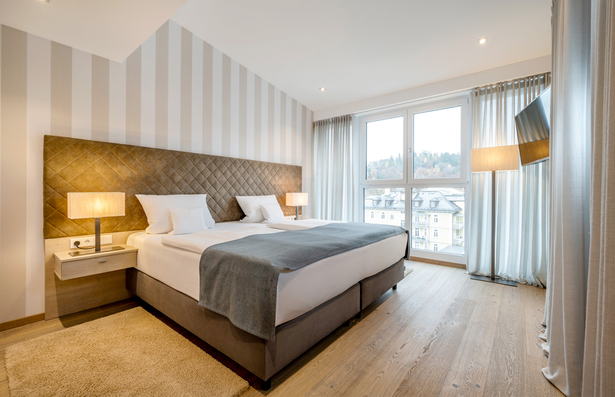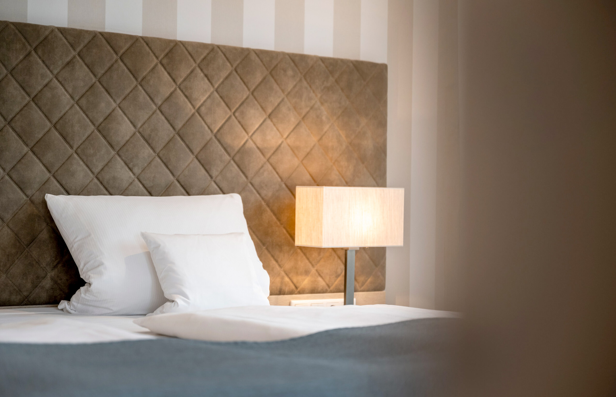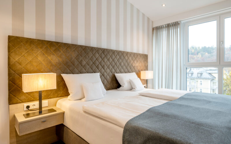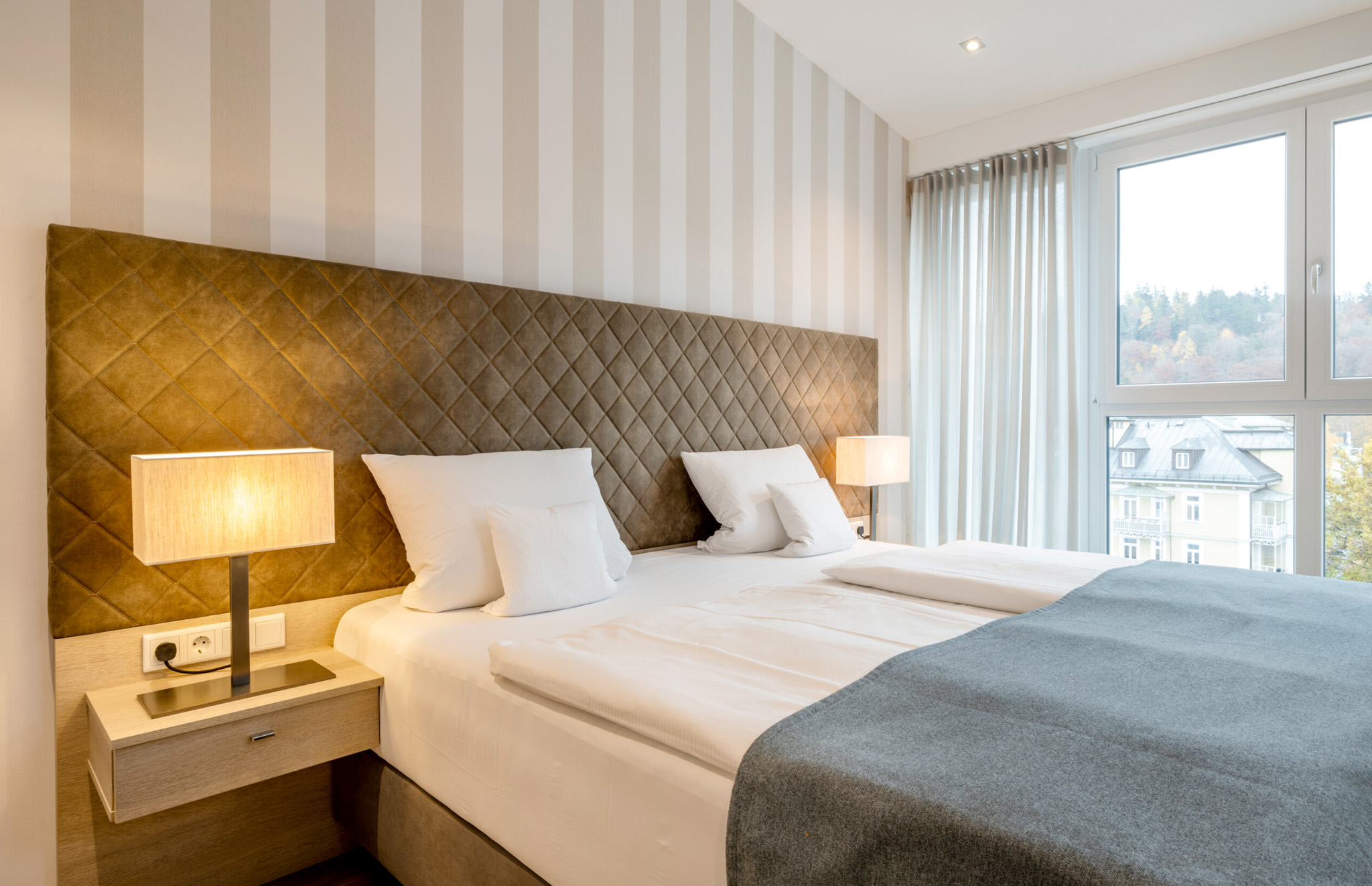 Boxspring-Bett und kuscheliger Bettwäsche der Firma Mühldorfer, sowie