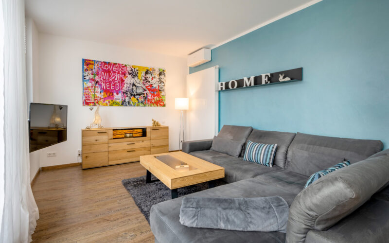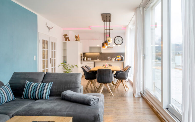 Es handelt sich um ein lichtdurchflutetes Penthouse im 5. OG mit großer Dachterrasse und großen bodentiefen Fenstern.