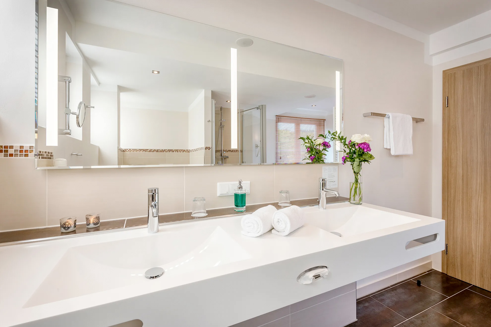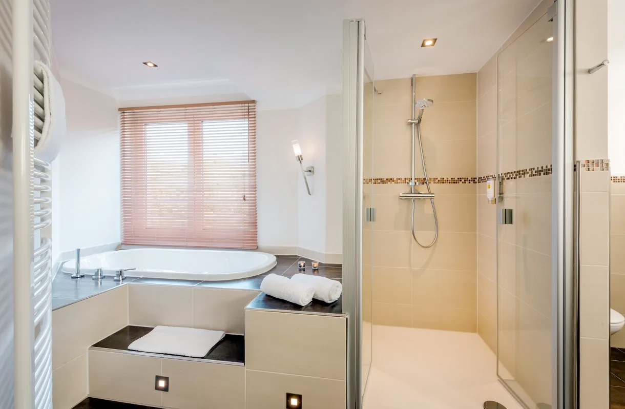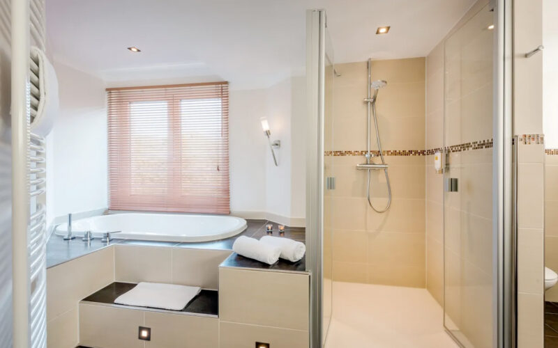 • Badezimmer mit Dusche und Badewanne, WC, beleuchteter Kosmetikspiegel und Föhn